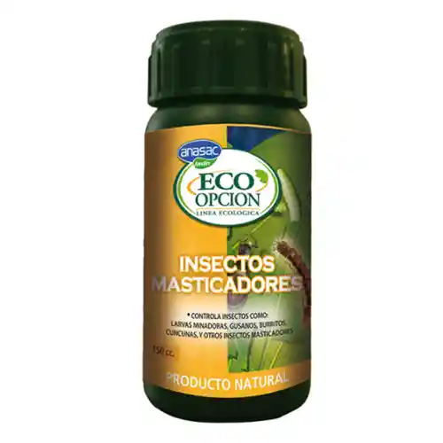 MASTICADORES ECO OPCION 150 CC ANASAC DESCRIPCION Insecticida para el control eficaz de insectos masticadores tales como larvas minadoras, gusanos, burritos, cuncunas y otros insectos masticadores. Es un producto de origen natural a base de esencias orgánicas, siendo muy seguro para el manejo doméstico, sin riesgos para personas y mascotas. Es recomendable para el uso en plantas comestibles. DOSIS Y FORMA DE USO Diluir 10 cc. del producto en 1 lt. de agua, y asperjar por toda la planta. Se debe aplicar al atardecer. Se recomienda repetir a la semana de aplicación. FORMULACIÓN Cada 100 cc. contiene Proteínas de alta calidad biológica, carbohidratos, aminoácidos esenciales y no esenciales. Vitaminas, B2, E Y A. Ingredientes inertes c.s.p. ……… 100 %