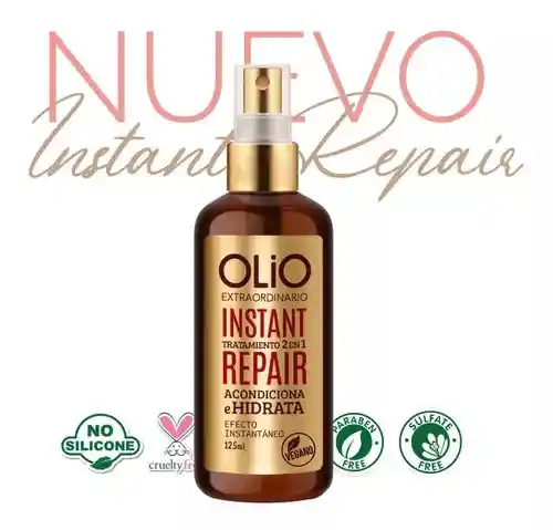 Desenredante instantáneo para todo tipo de cabello, actua en 2 fases: la primera acondiciona y repara, mientras que la segunda nutre e hidrata. Al actuar sobre las proteinas reestructurantes aumenta el cuerpo y la flexibilidad del cabello dejandolo suave y sedoso. Modo de uso: agitar antes de usar, luego de vaporizar e forma uniforme sobre el cabello húmedo o seco. No enjuagar y proceder al peinado. Producto Olio.