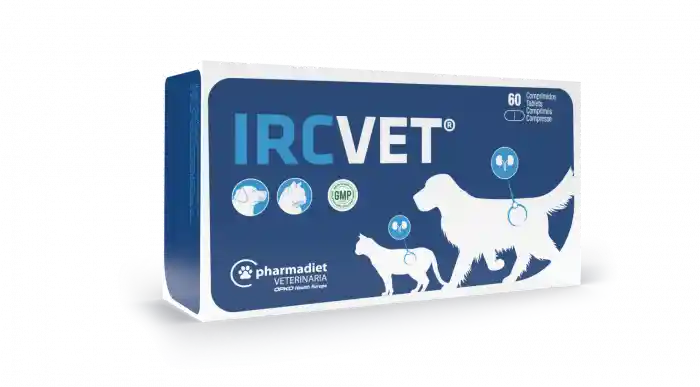IRC-Vet es un complemento para perros y gatos que frena el avance de la insuficiencia renal crónica y ayuda a los riñones dañados a que realicen sus funciones. Además, mejora la función renal y previene la mineralización, a inflamación y la fibrosis renal. El extracto de Alcachofa es hepatoprotector y digestivo. Estimula el apetito, es antiemético, espasmolítico, colerético y colagogo. Este complemento disminuye la cantidad de fósforo y reduce su contenido en la sangre. Después, es eliminado a través de las heces. Está indicado para tomar junto con una dieta controlada en proteínas, sodio y fósforo para evitar que la enfermedad siga avanzando. La presencia de vitaminas B6 y B12 normalizan la escasez de otro tipo de vitaminas y disminuyen los síntomas de progresión de la enfermedad. IRC- Vet está fabricado por el laboratorio Pharmadiet Veterinaria, con una fórmula basada en Quercetina, ácido fólico, trans-Resveratrol de un extracto de Polygonum cuspidatum, hidróxido de aluminio, vitaminas B6 y B12, y extracto seco de alcachofa. VENTAJAS: Complemento para perros y gatos que padecen insuficiencia renal crónica. Ayuda a que los riñones realicen sus funciones. Reduce la presencia de fósforo en la sangre aliviando los riñones dañados. Normaliza las deficiencias de vitaminas. Disminuye el avance de la enfermedad. USO Y ESPECIFICACIONES: Producto indicado como complemento alimenticio para perros y gatos con insuficiencia renal crónica. Puedes dar los comprimidos de forma directa en la boca de tu mascota o mezclar con su alimento habitual. Composición: Trans Resveratrol 100 mg, 120 mg de extracto seco del 2,5% alcachofas cinarina, hidróxido de aluminio 100 mg, 10 mg quercetina, vitamina 1,34 mg B6 (piridoxina), 134 mcg de ácido fólico, 0,66 mcg de vitamina B12 (cianocobalamina). Dosificación: Recuerda dejar agua a disposición del animal. Bajo supervisión de un veterinario. PESO Dosis PESO Dosis Hasta 10 Kg: ½ comprimido al día.De 10a 20 Kg: 1 comprimido al día.De 20 a 30 Kg:1 ½ comprimidos al día.Gatos: 1/2 comprimido al día. Si se prefiere, trocearlo y mezclarlo con el alimento habitual.Hasta 10 Kg: ½ comprimido al día. CONTIENE : 60 comprimidos.