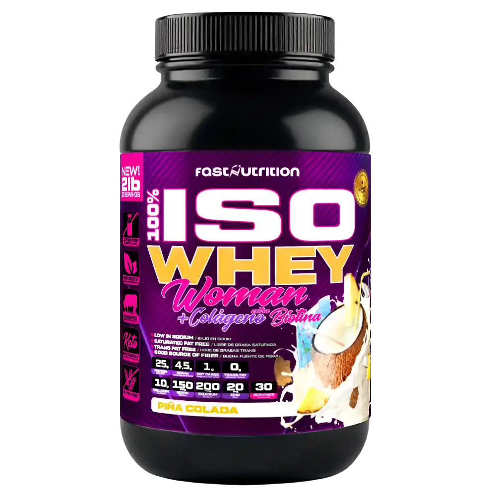 Nueva Proteína Iso Whey Woman + Colágeno Extra Biotina 25g de proteína. 6g de Aminoácidos ramificados (BCAAs). 10g de Colágeno. 150mg de Biotina. 20mg de Zinc. Principales Características: 0g Carbohidratos Netos. ENDULZADO CON ESTEVIA. LIBRE DE GLUTEN. AMIGABLE CON DIETAS KETO.