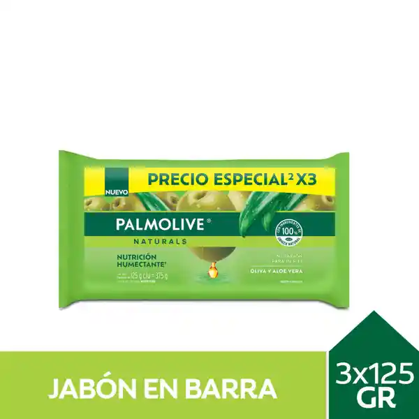 Contiene 3 Unidades de 125 g c/u. Mantén tu Piel Suave y Humectada Con el Jabón de Tocador Palmolive Naturals Oliva y Aloe Vera Nutrición Humectante. Su Fórmula Nutritiva Infusionada Con Ingredientes 100% de Origen Natural Funciona Como Alimento Para tu Piel. Mantiene la Humectación Natural de la Piel Con Ingredientes Humectantes.