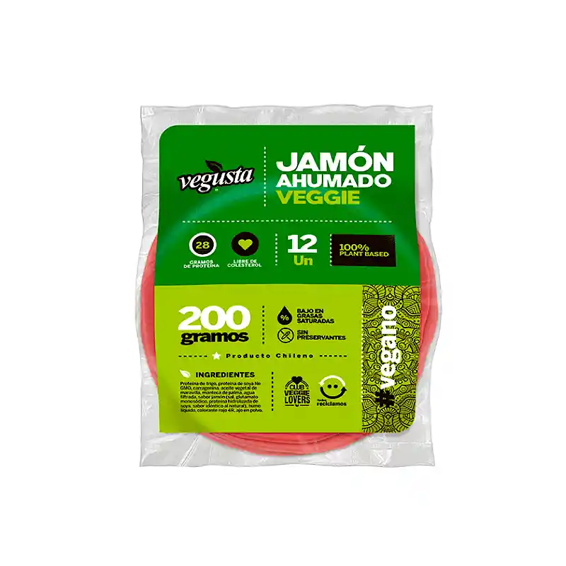 INGREDIENTES Agua filtrada, proteína de trigo (gluten), proteína de soya NO GMO, carragenina, aceite de maravilla, manteca vegetal de palma, sabor jamón (sal, proteína hidrolizada de soya, glutamato monosódico, saborizante idéntico al natural), ajo en polvo, humo liquido, colorante ponceau 4R. IMPORTANTE: Descongelar antes de usar, una vez descongelado, no volver a congelar. Una vez abierto mantener refrigerado hasta 7 días.