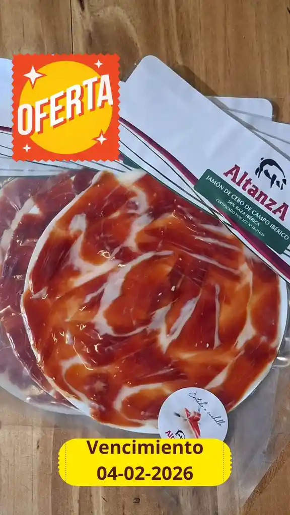 Jamón de cebo Ibérico 50% Raza Ibérica Altanza – Cortado a Cuchillo 50 g Elaborado a partir de cerdos de raza ibérica 50%, criados en libertad y alimentados en la dehesa. Este jamón destaca por su aroma intenso, sabor equilibrado y jugosidad única. Al estar cortado a cuchillo por maestros jamoneros, conserva toda su textura y matices, ofreciendo una experiencia auténticamente ibérica. Formato de 50 g listo para degustar, perfecto para un picoteo gourmet, maridar con vinos tintos, espumantes o un buen fino.