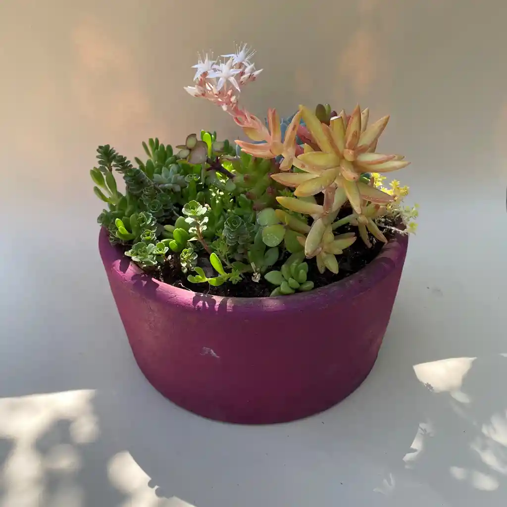 Jardín de 20 cm de diámetro en macetero de greda cuadrado color fucsia con más de 8 suculentas medianas en su interior.