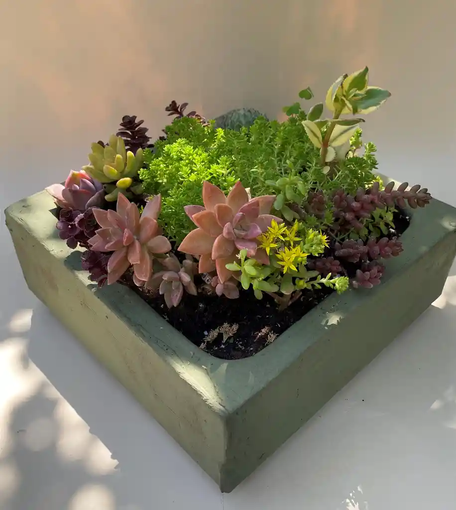 Jardín de 24 cm de diámetro en macetero de greda cuadrado color verde con más de 8 suculentas medianas en su interior.