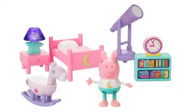 Es la Hora de Dormir Con Goodnight Peppa Playset. Peppa Está Lista Para Irse a la Cama Con su Lindo Pijama. Apaga Las Luces Para Disfrutar de un Poco de Diversión Que Brilla en la Oscuridad y Mira Las Estrellas Con el Telescopio de Peppa. Asegúrate de Encender su Luz de Noche Antes de Decir Buenas Noches. 1 Pijama de Peppa Que Brilla en la Oscuridad 1 Caballo Mecedor 1 Lámpara / Mesita de Noche (Iluminada) 1 Telescopio 1 Estantería Para Libros1 Cama. Se Recomienda de 2 Años en Adelante.