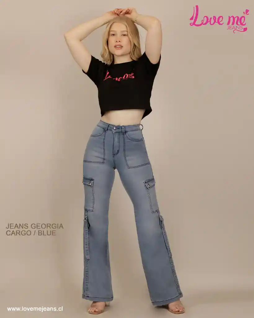 Jeans cargo con bolsillos en los costados, bota tipo palazzo, elasticado.