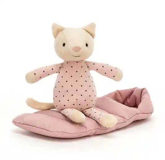 A Snuggler Kitty le encanta acampar con amigos y dormir bajo las estrellas! ¡Este gatito vainilla lleva un bonito mono rosa con un alegre cordón de lunares, a juego con ese saco de dormir rosado! Un amigo amable con abrazos reconfortantes para un primer viaje. Medidas aproximadas alto 23x12cm, 100% poliester, probado y aprobado según la norma europea de seguridad para juguetes: EN71 partes 1, 2 y 3, para todas las edades. Lavar a mano únicamente; no secar en secadora, limpiar en seco ni planchar. No se recomienda limpiar en lavadora. Verifique todas las etiquetas al llegar a la compra. Apto desde el nacimiento.