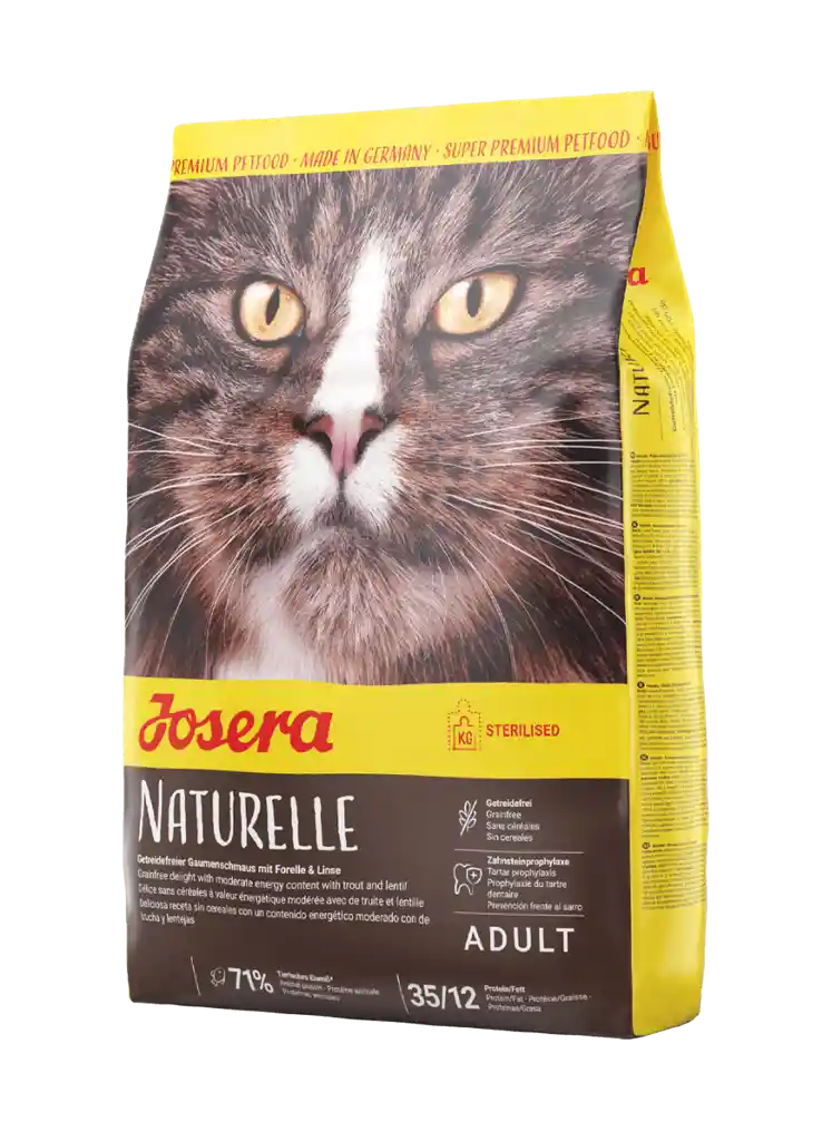 Josera Naturelle es un alimento completo indicado para gatos adulto esterilizados o con sobrepeso. Formulado con lentejas y truchas ofrece una sabrosa receta sin cereales con moderado contenido de grasa, para brindar a su gato el cuidado que se merece. Con profilaxis dental, gracias al contenido de tripolifosfato de sodio. Mantiene pH orina entre 6.0 y 6.5, reduciendo el riesgo de la formación de cálculos en el tracto urinario.