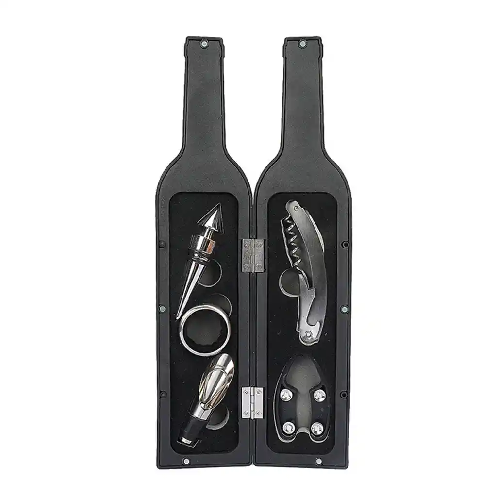 Juego de accesorios para Vino, viene con 5 piezas, incluye abridor de sacacorchos de vino, tapones de vino, cortador de aluminio, vertedor de vino, anillo de goteo, todo se muestra en una funda en forma de botella de vino, gracias a su diseño puede transportar todos los accesorios a cualquier lugar de forma rápida cómoda y sencilla. El diseño de la caja es ideal para un regalo para Navidad, Día de la Madre, Día del Padre, cumpleaños, festival, día de San Valentín, boda, inauguración de la casa o aniversario, cata de vinos, despedidas de soltero y otras ocasiones especiales. Incluye: • 1 x Cortador de precintos • 1 x Tapón para vino • 1 x Sacacorchos • 1 x Anillo anti-goteo • 1 x Dosificador