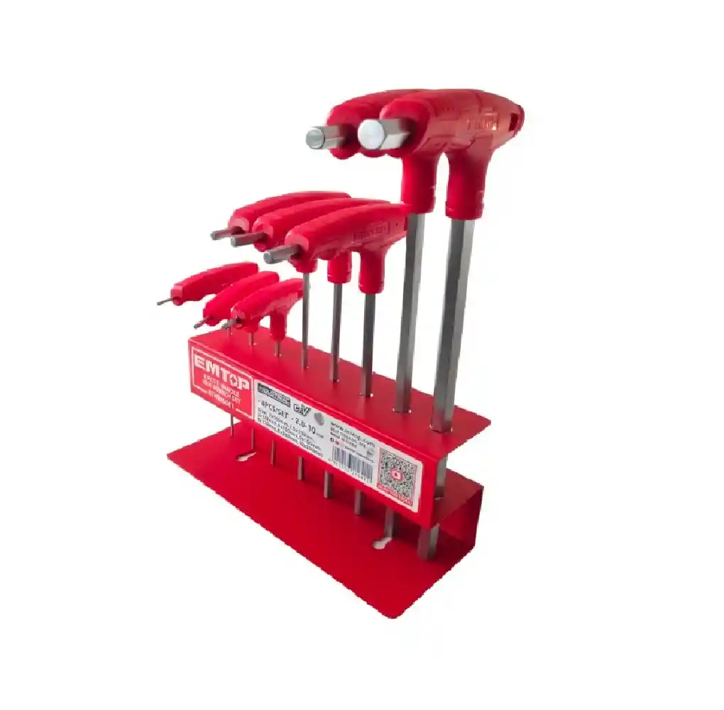 Juego de llaves hexagonales con mango en T que ofrece comodidad y eficiencia al aplicar fuerza en tornillos hexagonales. Este set incluye ocho piezas con diferentes tamaños, fabricadas en acero al Cromo Vanadio de alta resistencia, lo que garantiza durabilidad y rendimiento en cada uso. Gracias a su tratamiento térmico, las llaves cuentan con una mayor resistencia a la deformación, mientras que su acabado cromado las protege contra la corrosión, prolongando su vida útil. Es la herramienta ideal para trabajos mecánicos, mantenimiento y proyectos que requieren precisión y calidad profesional. Características: Juego De Llaves Allen T 8 Pz 2-10mm Juego de llaves hexagonales con mango en T de 8 piezas Tamaño: 2X75,2 / 5X75 /3X100 / 4X100 / 5X150 / 6X150 / 8X200 /10X200 Material: Cr-V, tratamiento térmico y placa cromada.