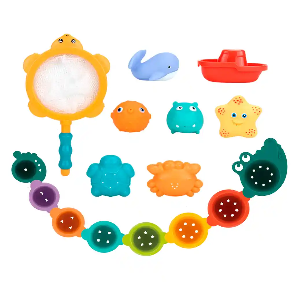 Juego de 16 juguetes para el baño. Este conjunto puede convertirse en el favorito de los pescadores principiantes, lo que hace que el baño sea aún más divertido. Ayuda a desarrollar habilidades Edad recomendada: 12 meses en adelante