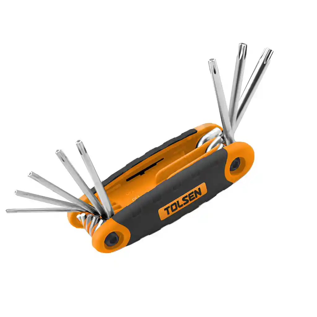 Juego de Llaves Torx Doblable T9 a T40. Medidas: T9, T10, T15, T20, T25, T27, T30, T40. Material CrV. Con tratamiento termico, cromado. Todos los Productos TOLSEN cumplen un estricto control de calidad en nuestro centro de pruebas equipado con el probador de por vida, test de impacto, medidor de dureza, test de dibujo, ensayos de materiales, test de voltaje, etc