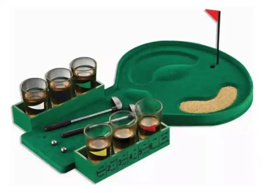Material plástico y metal La caja incluye 6 vasos de vidrio 2 putters de mini golf 2 bolas de metal 1 bandera 1 bolsita de arena Ya sea que le guste el golf, el golf en miniatura, el putting o simplemente tomar unas cervezas en el campo de golf, usted y hasta seis amigos probablemente disfrutarán jugando este nuevo y genial juego de juego para beber con vaso de chupito de golf . Este divertido campo de golf de mesa de 1 hoyo en miniatura permite que los jugadores se turnen para intentar meter una bola de metal en el hoyo y luego, una vez que la bola entra, contar cuántos putts se necesitaron para hundir la bola y seguir las instrucciones para beber en el lateral de el carrito de vasos de chupito. Cuanto mejores sean tus habilidades de tiro en comparación con tu nivel de alcohol en la sangre, determinará qué tan borrachos se ponen tus amigos. Lo mejor de todo es que incluso incluye un foso de arena real para que la pelota no se atasque. Perfecto para cualquier fiesta o intercambio de regalos