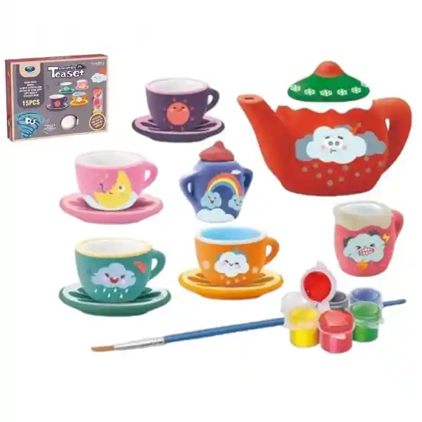 Este set te brinda la oportunidad de personalizar tu propio juego de té con creatividad y estilo. Incluye tazas, platillos, tetera y más, todo listo para que des rienda suelta a tu imaginación y crees un diseño único. Set de pintura 6 colores+ 1 pincel Medidas: 25x19cm caja