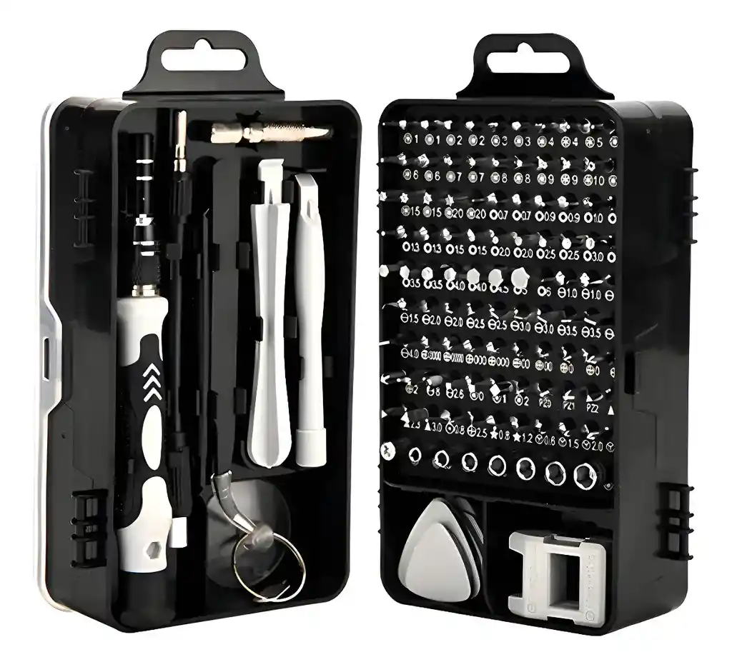 Kit Juego de destornilladores 115 en 1: Este conjunto multifuncional incluye 100 puntas de destornillador reemplazables y 15 accesorios de desmontaje, diseñados para satisfacer una amplia gama de necesidades de reparación. Adecuado para la reparación de una variedad de electrodomésticos y dispositivos electrónicos de precisión, como televisores, aires acondicionados, teléfonos móviles, tabletas, computadoras, relojes y consolas de juegos. Variedad de brocas especiales: El kit cuenta con una selección de puntas de destornillador de diferentes tipos, fabricadas en acero al cromo vanadio, para cubrir todas las necesidades de reparación. Incluye una parte superior giratoria sobre rodamientos de bolas para facilitar la operación. Material de calidad superior: Las puntas de destornillador magnéticas de precisión están hechas de acero al cromo vanadio de alta calidad con una dureza de 55-60HRC, lo que garantiza durabilidad y precisión sin dañar los dispositivos. Todas las puntas son magnéticas y se conectan de forma estable al mango. Mango antideslizante: Diseñado ergonómicamente para un agarre fácil y seguro, el mango del destornillador también incluye pinzas antiestáticas. El conjunto magnético facilita la realización de reparaciones de manera flexible y precisa. Diseño portátil: El conjunto de herramientas es ligero y compacto, ideal para llevar en una mochila o bolso. Viene con una caja de almacenamiento a prueba de golpes que protege los accesorios y facilita el transporte. Especificaciones: - Material: acero aleado al cromo vanadio - Tipo: Conjunto multifuncional - Tamaño: 19.5 * 11 * 6CM - Número de piezas incluidas: 115 piezas - Sistema métrico Accesorios: 98 bits - Manga hexagonal 10 líneas horizontales: M2.5, M3.0, M3.5, 2 * M4.0, M4.5, M5.0, M5.5 - Philips / Cross: 2 * PH0000, 2 * PH000, 2 * PH00, 2 * PH 0, 2 * PH 1, 2 * PH 2 - Word: SL 1.0, 4 * SL 3.0, 2 * SL 2.0, 2 * SL 2.5, 2 * SL 3.5, SL 4.0 - Torx: 2 * T 2, 2 * T 3, 2 * T 4, 2 * T 5, 1 * T 1, 1 * T 6, 1 * T 7, 1 * T 8, 1 * T 9, 1 * T 10, 1 * T 15, 1 * T 20 - Seguridad Torx: T 6 H, T 7 H, T 8 H, T 9 H, T 10 H, T 15 H, T 20 H - Hexagonal: H5, H6, H0.7, H0.9, H1.3, H1.5, H2.0, H2.5, H3.0, H3.5, H4.0, H4.5 - Tipo Y: segunda línea: 2 * Y 0.6, Y2.0, Y2.5, Y3.0 - Pentagonal: 2 * 0.8, 2 * 1.2, 1 * 1.5, 1 * 2.0 - Triángulo: 2.0, 2.3, 2.6, 3.0 - Tipo U: 2 * 2.6, 2 * 3.0 - Destornillador de cabeza plana: PZ00, PZ0, PZ1, PZ2 - Orientación: S 0, S 1, S 2 - Posición especial: medio 2.0, medio 2.5 - PIN SIM: 0.8, 1.0 17 * Otros accesorios: - 2 * palanca de plástico - 1 * palanca de doble cabeza - 6 * herramienta Triángulo - 1 * mangas hexagonales - 1 * manija telescópica de caja de plástico - 1 * eje de extensión duro - 1 * eje de extensión liso - 1 * pinzas - 1 * sumar y restar herramientas magnéticas - 1 * pin de tarjeta - 1 * Iechón