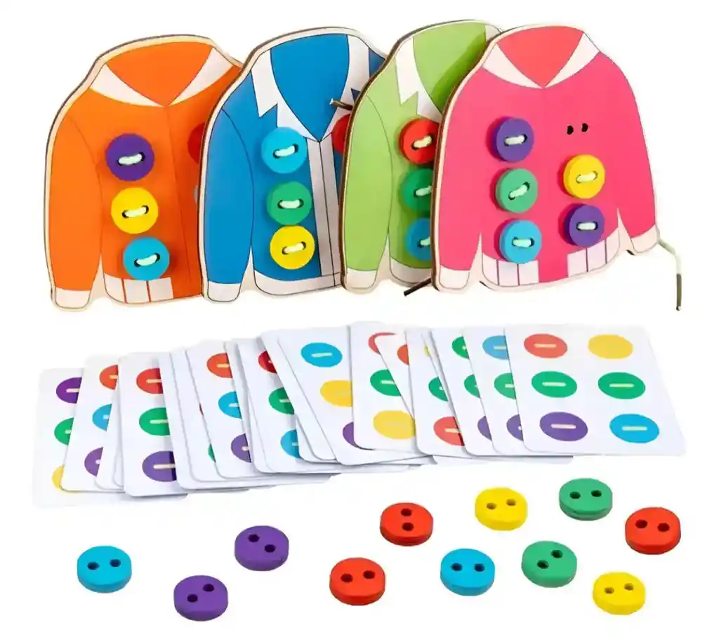 Este juego didáctico de enhebrado con botones es un material educativo diseñado para desarrollar la motricidad fina y la coordinación mano-ojo en niños. Consiste en piezas de madera con forma de prendas (como chaquetas de colores), botones de distintos colores y tarjetas guía, junto con cordones para enhebrar. El objetivo es que el niño siga los patrones de las tarjetas o cree sus propios diseños, pasando el cordón por los orificios y colocando los botones correctamente. Esta actividad fomenta habilidades clave como la concentración, la lógica, la coordinación y la creatividad, mientras se divierte. Características principales: • Material de madera resistente y seguro • Botones y colores llamativos que estimulan el aprendizaje • Incluye tarjetas con patrones para guiar el juego • Ideal para desarrollar la motricidad fina y la paciencia • Perfecto para uso en casa, jardines infantiles o terapia ocupacional Es un juguete educativo entretenido y útil para el aprendizaje temprano, ayudando a los niños a practicar habilidades importantes de forma lúdica