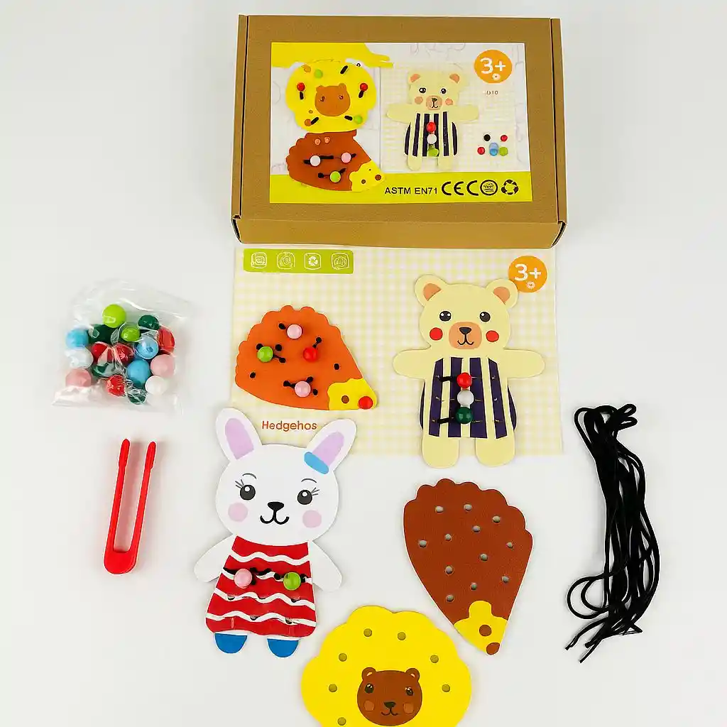Divertido y colorido juego de animales con cuerda, ideal para estimular la coordinación, la motricidad fina y la concentración de los más pequeños. Cada figura de animal cuenta con orificios y cordones para que los niños puedan enhebrar, pasar y jugar, desarrollando habilidades mientras se divierten. Características principales • Contiene figuras de animales (león, oso, conejo y más). • Incluye cordones de colores para enhebrar. • Fabricado en madera resistente y ecológica, con pintura no tóxica. • Recomendado para niños de 3 años en adelante. • Cumple con normas de seguridad CE, ASTM y EN71. • Promueve la coordinación ojo-mano y la concentración. Beneficios • Favorece la motricidad fina y la destreza manual. • Estimula la creatividad y la paciencia. • Ideal para juegos educativos en casa o jardín infantil. • Regalo perfecto para niños y niñas curiosos y activos. Contenido del paquete • 4 figuras de animales de madera. • Cordones de colores. • Caja ecológica de cartón reciclable