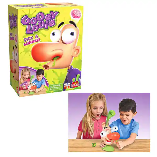 Juego Pegajoso Louie v4.0. Los jugadores se meten un dedo en la nariz y sacan una sustancia pegajosa. Si eliges la pegajosa equivocada, la cabeza de Louie se abre y su cerebro sale volando. Número de jugadores: 2-4 Elige un ganador usando Gooey Louie; ¿Quién puede olfatear lo que descubrirás si te esfuerzas? Ten cuidado: si eliges la pegajosa incorrecta de Louie, su cráneo se abrirá de golpe, sus ojos se abrirán y su cerebro explotará. Este juego apto para niños promueve el crecimiento de la coordinación mano-ojo y la motricidad fina (¡y gruesa!). ¡Qué divertido puede ser realmente un juego de mocos!