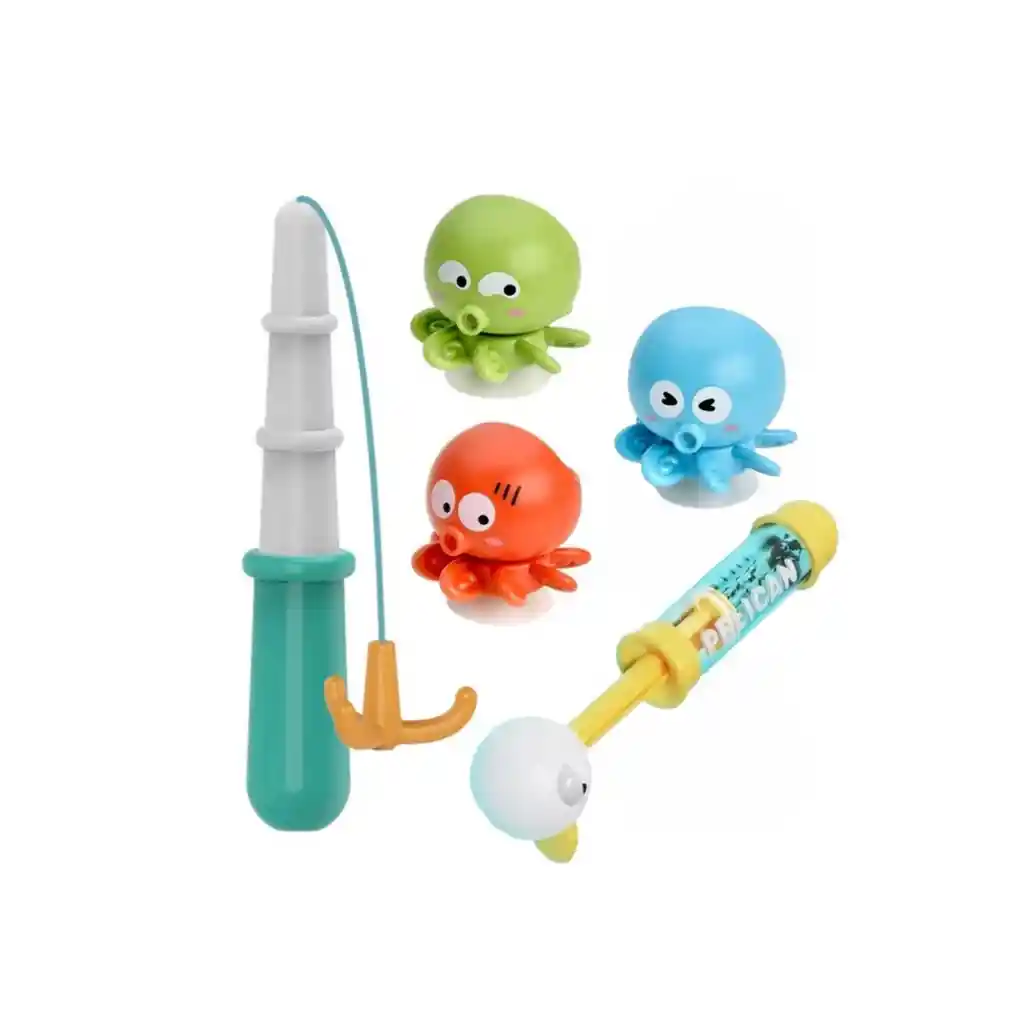 Juguete Atrapa Pulpos. ¡Diversión acuática asegurada con nuestro emocionante juego Atrapa Pulpos! Este vibrante juego de pesca para el baño incluye 5 piezas: 3 coloridos pulpos giratorios con ventosas, una caña de pescar y un encantador pelícano que lanza chorros de agua. Perfecto para convertir la hora del baño en una aventura llena de emoción y risas. Cada pieza está cuidadosamente diseñada para captar la atención de los más pequeños y estimular su imaginación con colores brillantes y diseños atractivos. Con varias formas de jugar: Pesca activa: Los niños pueden usar la caña para atrapar los pulpos mientras flotan en el agua. Pega y juega: Además, pueden pegar los pulpos a las paredes de la bañera o ducha con las ventosas, creando un juego dinámico y entretenido. Diversión a chorro: Con el pelícano, pueden lanzar chorros de agua a los pulpos para hacer girar sus tentáculos, ¡convirtiéndolos en molinos acuáticos! Este juguete no solo es divertido, sino que también promueve el desarrollo de habilidades esenciales. Los pequeños ejercitarán su coordinación ojo-mano y habilidades motoras finas mientras se concentran en la acción de pescar o lanzar agua a puntos específicos.
