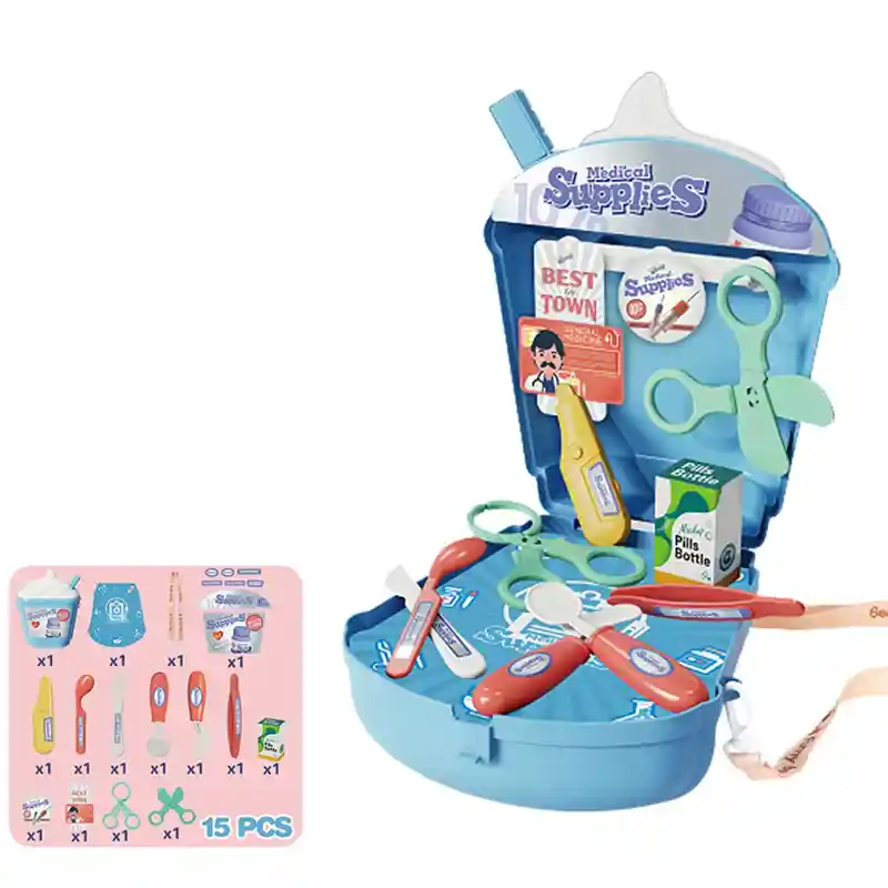 . Material: Plástico . Color: Celeste . Dimensiones: 22 cm x 17cm x 9 cm (Aprox) . Edad recomendada: A partir de 3 años . Contiene: 01 Caja de almacenamiento + 15 Piezas de instrumentos de medicina (Tijeras, Termómetro, Jeringa, Píldoras (caja simulada), Otoscopio, Cuchara médica, Tarjeta de identificación, Bisturí, Pinzas, entre otros accesorios) . Este set de médico infantil es ideal para que los niños desarrollen su imaginación y creatividad mientras aprenden a cuidar a sus muñecos y juegan a ser doctores. . Viene en un práctico estuche tipo mochila en forma de helado que permite transportar todas las piezas fácilmente y mantenerlas organizadas. . Fomenta el aprendizaje de conceptos básicos de la medicina y el cuidado del cuerpo. . Este set ayuda a desarrollar habilidades sociales, empatía y confianza. Además, es una excelente opción de regalo para cumpleaños o fechas especiales.