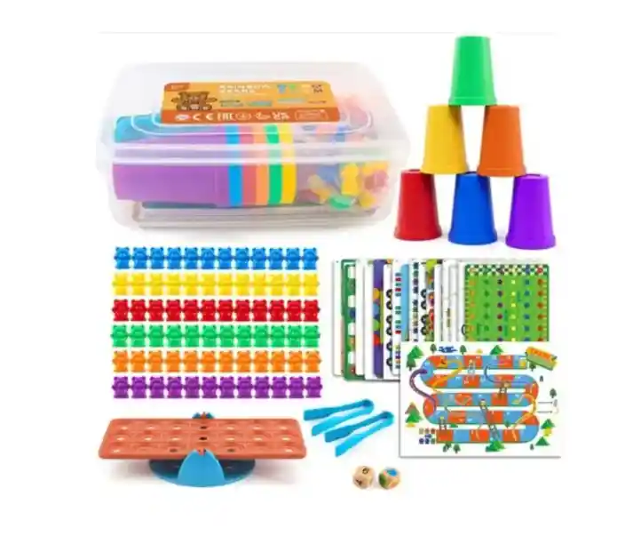 Ideal para desarrollar la motricidad fina de tu hijo. La caja cuenta con todo lo necesario para que los niños desarrollen su creatividad, pensamiento lógico, razonamiento y motricidad. La idea es que los niños sean capaces de agrupar, clasificar, contar, jugar, todos los que ellos quieran. lo importante con este set de juego es que puede realizar diversas actividades y lo mejor es ir aprendiendo a través del juego. La caja contiene: 60 osos 2 pinzas 6 vasos Incluye un set de tarjetas con actividades sugeridas Edad recomendada: +3 años. Material: ABS. Sin garantía