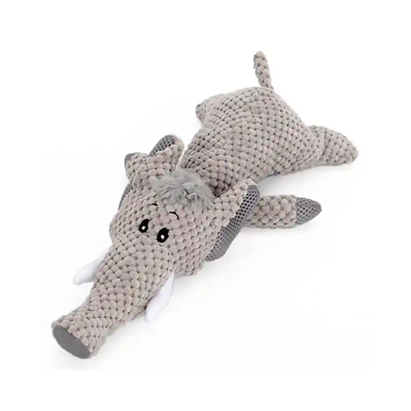 Este adorable peluche con forma de elefante es el compañero ideal para tu perro, brindando horas de diversión y entretenimiento. ESPECIFICACIONES - Diseño: Elefante de tela suave tipo cotelé. - Color: Gris con detalles en blanco y negro. - Incluye sonido para estimular el juego. RECOMENDACIONES Perfecto para perros de todos los tamaños. Supervisa el uso en mascotas muy destructivas para mayor durabilidad. CUIDADOS Lavar a mano con agua fría y secar al aire libre para mantener el peluche en óptimas condiciones.