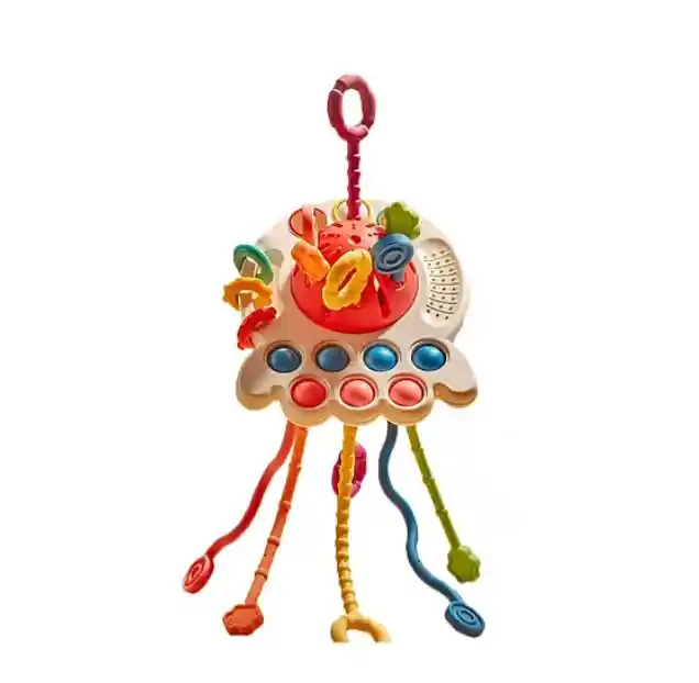 Juguete sensorial Montessori con cable Montessori 4 en 1 Características: **El juguete incluye tres estilos de juego diferentes: arriba y abajo, golpe y pelota. Una variedad de formas de jugar fomentan la curiosidad del bebé por el mundo y ayudan a mejorar las habilidades motoras de los dedos del bebé. **Todas las partes de la línea de juguetes sensoriales están hechas de silicona apta para uso alimentario, segura y no tóxica. Masajea las encías del bebé, alivia sus emociones y le permite masticar con confianza. El juguete está diseñado con la forma favorita del bebé. Los colores pastel intensos pueden promover el conocimiento de los patrones de color del bebé, atraer su atención y sumergirlo en el mundo de los juegos educativos.