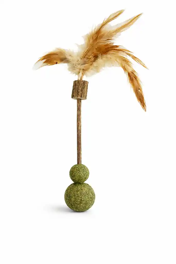 Juguete varita de madera con plumas naturales y bolas de catnip. Ideal para estimular el instinto de caza y el ejercicio físico de tu gato. El diseño incluye dos bolas de catnip unidas a la base y plumas en la parte superior para atraer la atención del felino. Fabricado con materiales naturales: madera, plumas y catnip. No contiene piezas tóxicas. Fácil de limpiar. Especificaciones: Dimensiones: 20 x 4 cm aprox. Contenido: 1 Juguete. Animales recomendado: Gatos.