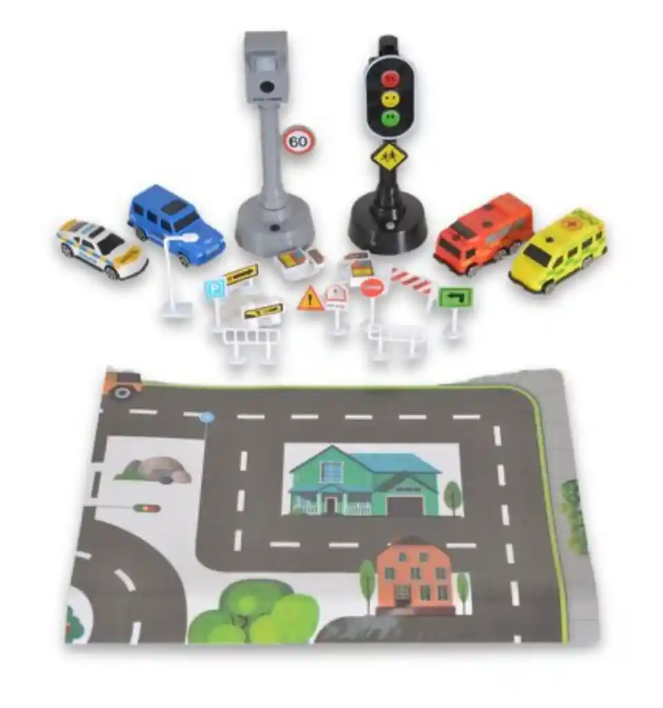 ¡El juego perfecto para que los niños aprendan normas de tránsito mientras se divierten! Este completo set de tráfico infantil incluye semáforos con luces y sonido, señales de tránsito y vehículos de emergencia como policía, ambulancia, carro de bomberos y furgón policial. Es un juguete ideal para estimular la imaginación, la coordinación y el aprendizaje vial desde pequeños. Características principales: • Incluye 4 vehículos metálicos/plásticos: policía, ambulancia, bomberos y transporte especial. • Semáforo inteligente con luz real y sonidos (botón de prueba ). • Señales de tránsito educativas para armar pequeñas ciudades. • piezas en total para crear múltiples escenarios. • Ideal para que los niños aprendan sobre seguridad vial y reglas de tránsito mientras juegan. • Apto desde 3 años en adelante. • Perfecto para regalo, juegos educativos, salas de clase o uso recreativo.