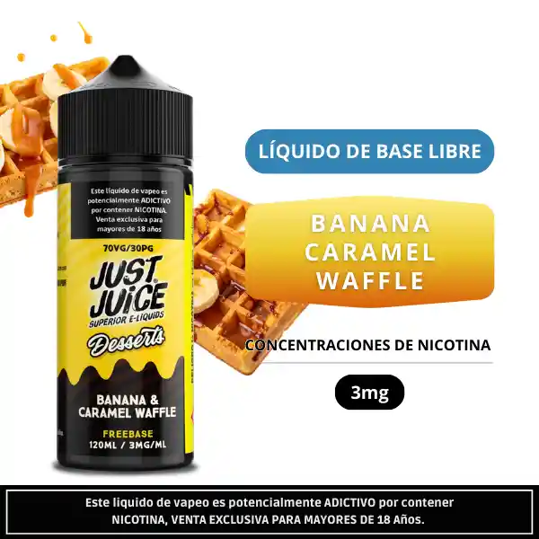 Just Juice Banana Caramel Waffle 120ml es un e-líquido de gran formato que combina banana madura, caramelo dulce y waffles esponjosos, creando un perfil postre cálido, cremoso y perfectamente equilibrado. Formulación 70VG30PG, ideal para nubes densas y sabor prolongado.