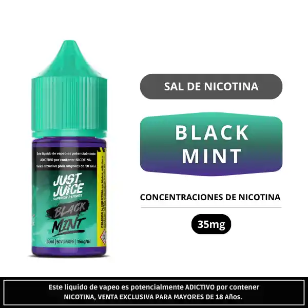 Just Juice Black Mint Salt 30ml es una sal de nicotina de 30ml con menta profunda e intensa, ofreciendo una sensación fresca, potente y limpia en cada calada. Formulación 50VG50PG, ideal para pods, con 35mg de nicotina.