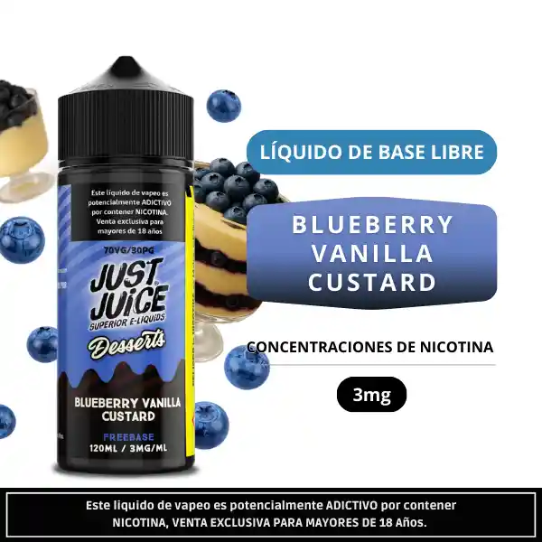 Just Juice Blueberry Vanilla Custard 120ml es un e-líquido de gran formato que combina arándanos dulces con una suave crema de vainilla tipo custard, creando un perfil postre cremoso, equilibrado y envolvente. Formulación 70VG30PG, ideal para nubes densas y sabor prolongado.