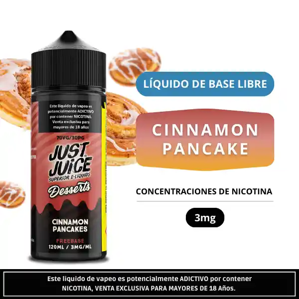 Just Juice Cinnamon Pancake 120ml es un e-líquido de gran formato que combina panqueques esponjosos con un toque cálido de canela, creando un perfil postre dulce, especiado y reconfortante. Formulación 70VG30PG, ideal para nubes densas y sabor prolongado.
