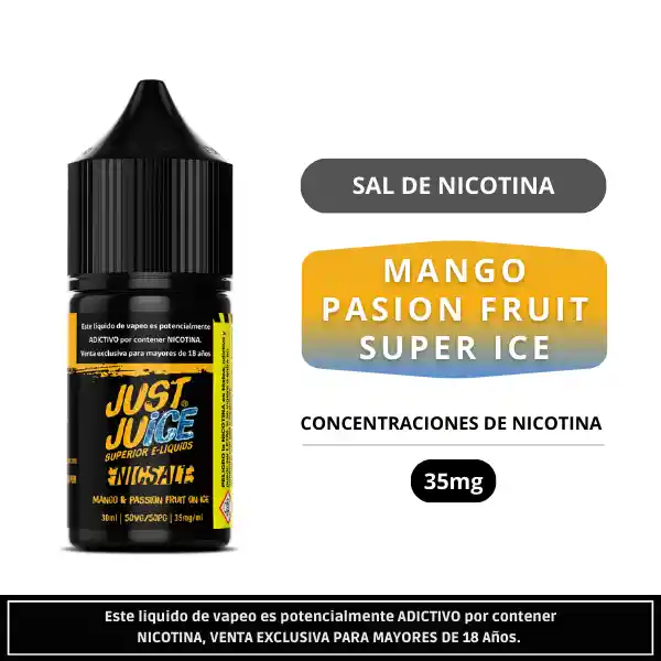 Just Juice Mango Passion Fruit Super Ice Salt 30ml es una sal de nicotina de 30ml que combina mango maduro con maracuyá intensa y un potente efecto super ice, ofreciendo una experiencia tropical ultra refrescante. Formulación 50VG50PG, ideal para pods, con 35mg de nicotina.