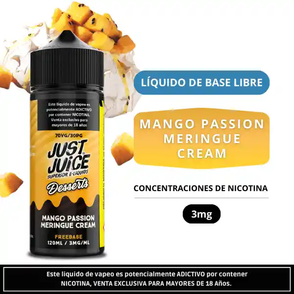 Just Juice Mango Passion Meringue Cream 120ml es un e-líquido de gran formato que combina mango maduro y maracuyá con una suave crema de merengue, creando un perfil tropical, cremoso y perfectamente equilibrado. Formulación 70VG30PG, ideal para nubes densas y sabor prolongado.