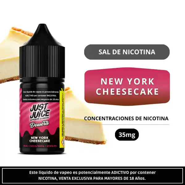 Just Juice New York Cheesecake Salt 30ml es una sal de nicotina de 30ml inspirada en el clásico cheesecake estilo New York, con un perfil cremoso, suave y perfectamente equilibrado. Formulación 50VG50PG, ideal para pods, con 35mg de nicotina.