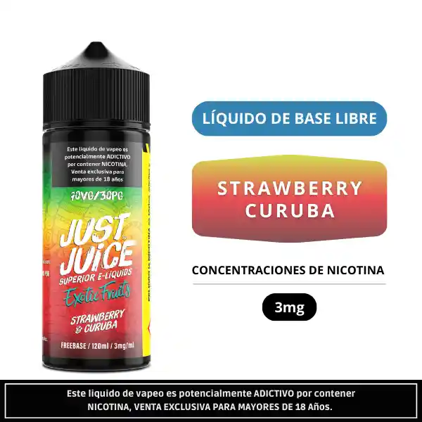 Just Juice Strawberry Curuba Ice 120ml es un e-líquido de gran formato que combina la dulzura de la frutilla con el carácter exótico de la curuba y un refrescante toque ice. Formulación 70VG30PG, ideal para nubes densas y un sabor frutal equilibrado.