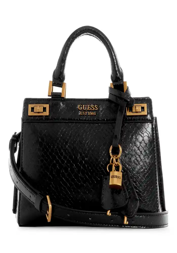 Modelo: KB787073. Mini cartera con doble asa de mano y correa ajustable al hombro. Diseño de tono liso con relieve de serpiente pitón y aplique de letras Guess en parte frontal. Con bolsillos con cierre de cremallera. Materiales: 100% PU.