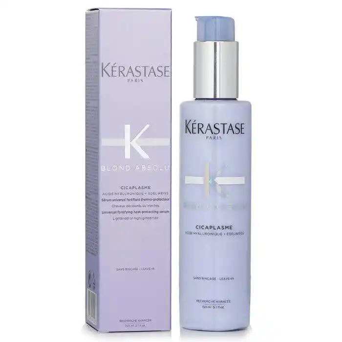 El Kérastase Cicaplasme es el sérum fortificante y protector térmico estrella de la línea Blond Absolu. Es un tratamiento en crema de color lavanda (sin aclarado) diseñado para todo tipo de rubios.