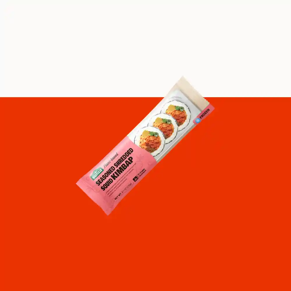 Kimbap coreano relleno con “calamar” vegetal estilo marino, arroz sazonado y vegetales frescos, todo envuelto en alga nori. Una alternativa 100% vegetal que imita el sabor y la textura del calamar tradicional, sin ingredientes de origen animal.