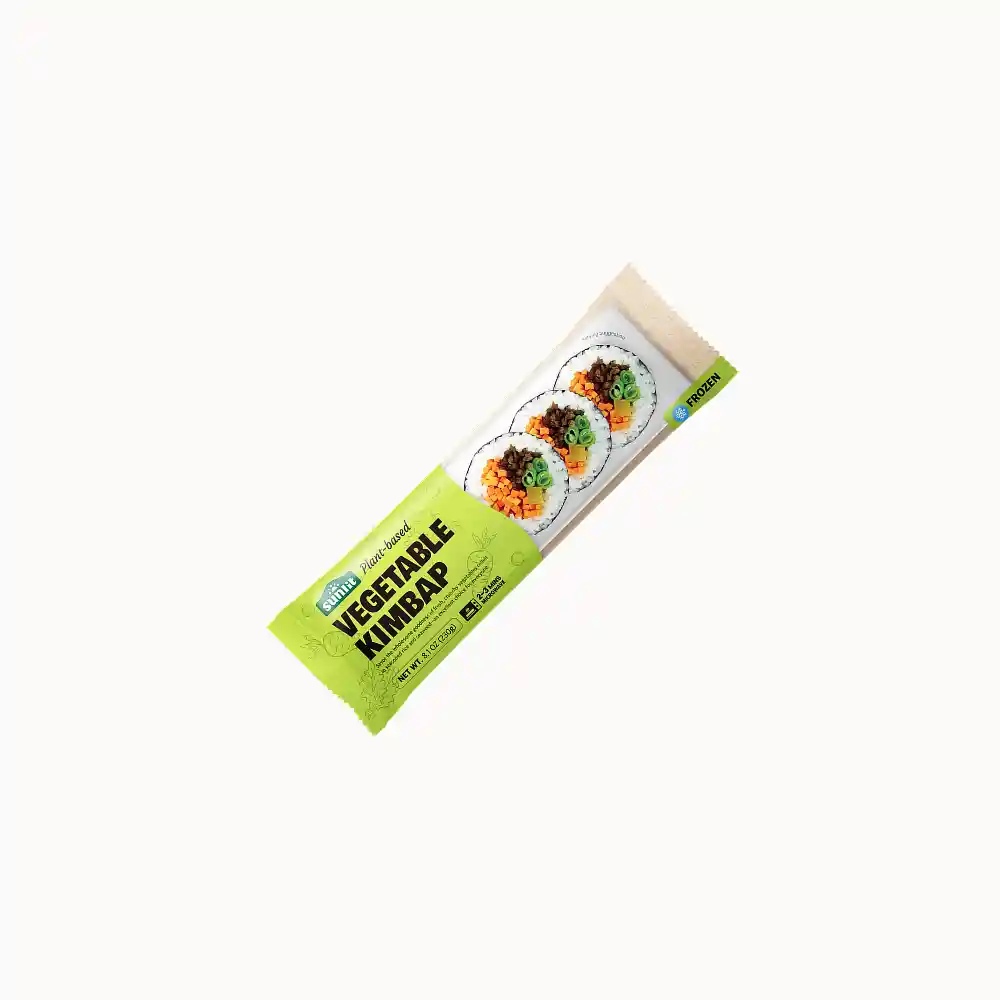 Clásico kimbap coreano 100% vegetal, relleno con arroz sazonado, zanahoria, espinaca, pepino, rábano encurtido (danmuji) y tofu marinado, todo envuelto en alga nori.