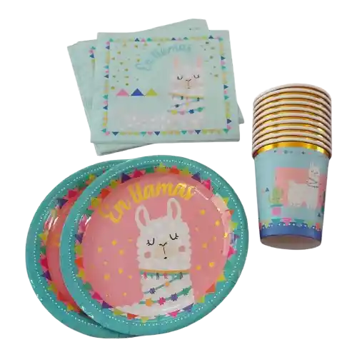 SET 10 PLATOS DE 18CM LLAMA SET 10 VASOS 400ML COTILLON LLAMA SET 12 SERVILLETAS COTILLON LLAMA