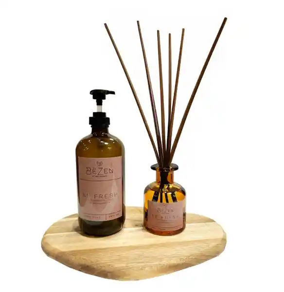 Kit Bezen Contiene 3 Unidades. Jabón Líquido 500 mL + Difusor 150 mL + Bandeja de Madera 1 Und. Jabón Líquido: Envase: Color Ámbar$ Uso: Manos y Cuerpo$ Difusor: Envase: Color Ámbar$ Bandeja de Madera Color Natural: Medidas: Largo: 28 cm x Ancho: 20 cm. Tenemos el Look Completo Para Darle Vida Elegancia y Calidez a tu Baño!.