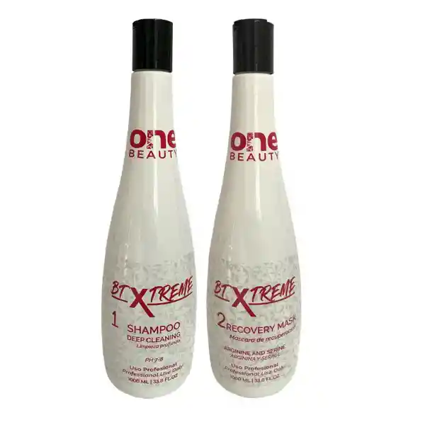 Kit BTXtreme 1000 ML, Es un tratamiento de botox capilar reconstructor intensivo, con un proceso de transformación inmediata, altamente hidratante, un sistema innovador desarrollado con componentes que actúan rellenando la estructura de la hebra capilar, reconstruyendo y devolviendo elasticidad, resistencia, brillo y masa perdida por procesos químicos en las áreas que se encuentran sensibilizadas suavizando rejuveneciendo el cabello gracias a la presencia de colágeno, posee micro pigmentos violeta, que cumplen la misión de matizar suavemente reflejos cálidos y evitar la oxidación de la hebra capilar. Se compone de activos innovadores a bases de aminoácidos y proteínas que penetran en la base capilar, reponiendo las cutículas y manteniéndolas compactas, unidas y cerradas eliminando frizz y volumen. Contenido: 1 Litro cada botella. • Arginina Y Serina: son aminoácidos esenciales, que constituyen mas de un tercio de los presentes, que se encuentran en forma natural en el cabello, obteniendo una mayor afinidad con las zonas mas dañadas. • Colágeno: Proteína que cuyas bondades incluyen la hidratación y reparación de la fibra capilar, evitar la deshidratación, promueve el aumento del diámetro del cabello haciéndolo suave, fuerte, brillante, sedoso, luminoso, visiblemente más grueso y denso. • Pigmento Violeta: Cumple la función de neutralizar suavemente los reflejos no deseados sin alterar el color. • Extracto de semilla de uva: su principal característica es una fuente de Vitamina E y omega 3 además de contener una gran cantidad de antioxidantes que protegen el cabello de los agentes externos. • Blend de aminoácidos: fortalecen la estructura dañada del cabello por cualquier trabajo químico o mecánico (plancha o secador) También fortalecen el cabello, dejándolo más resistente. • Blend de siliconas de brillo: Otorgan gran efecto cosmético, suavidad y brillo protegen el cabello contra el calor del secador o plancha. • Ácido láctico: Encargado de disciplinar cabello y cierre de las cutículas, bajando friz y volumen. • Filtro UV: Son los ingredientes activos que absorben la radiación ultravioleta. Producto One Beauty