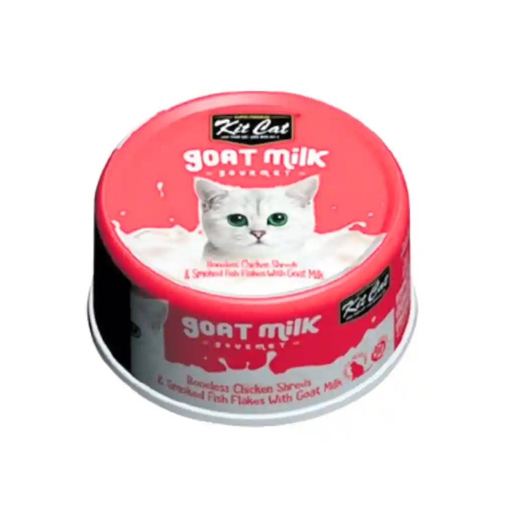 Kit Cat Goat Milk Gourmet Chicken Smoked Fish es un alimento húmedo para gatos que incorpora prebióticos promoviendo una flora intestinal más activa y mejorando el sistema inmunitario de tu gato. Ideal para gatos que tienen estómagos sensibles y sufren de diversos problemas digestivos. La leche de cabra contiene propiedades anti mucosas y antiinflamatorias. Súper refuerzo inmunológico. También se añaden componentes nutricionales esenciales como la vitamina E, ácidos omegas 3 6 y taurina, aportando un beneficio extra para el bienestar de tu mascota. Contienen carne de grado humano, no contienen rellenos, subproductos, colorantes ni conservantes añadidos, y 100% libres de granos. Perfecto para gatos en todas las etapas y estilos de vida. Beneficios: Aumenta indirectamente el consumo de agua diaria, reduciendo el riesgo de cálculos renales o patologías del tracto urinario. Perfecto para gatos que tienen estómagos sensibles y sufren de diversos problemas digestivos. La leche de cabra contiene propiedades antiinflamatorias y promueve la disminución de mucosidades. Entrega un súper refuerzo inmunológico. Contiene prebióticos (fructooligosacáridos) que ayudan a la digestión, estimulan la función inmunológica y la síntesis de vitaminas. Contiene taurina. Ideal para gatitos que son quisquillosos con su comida. En virtud de la gran cantidad de vitaminas, oligoelementos, enzimas y ácidos grasos, la salud general de tu mascota experimenta una notable mejoría al incorporar leche de cabra en su dieta. Ingredientes: Pollo fresco deshuesado, escamas de pescado ahumado, agente espesante, leche de cabra en polvo, vitamina E, taurina, fructooligosacáridos, agua.