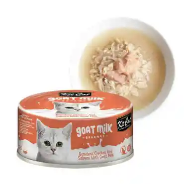 Kit Cat Goat Milk Gourmet Chicken Salmon es un alimento húmedo para gatos que incorpora prebióticos promoviendo una flora intestinal más activa y mejorando el sistema inmunitario de tu gato. Ideal para gatos que tienen estómagos sensibles y sufren de diversos problemas digestivos. La leche de cabra contiene propiedades anti mucosas y antiinflamatorias. Súper refuerzo inmunológico. También se añaden componentes nutricionales esenciales como la vitamina E, ácidos omegas 3 6 y taurina, aportando un beneficio extra para el bienestar de tu mascota. Contienen carne de grado humano, no contienen rellenos, subproductos, colorantes ni conservantes añadidos, y 100% libres de granos. Perfecto para gatos en todas las etapas y estilos de vida. Latas de 70 g.