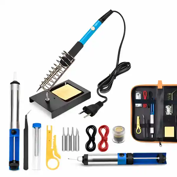 Kit Contiene 15 Unidades. Completo de Soldadura 60W es la Solución Ideal Para Trabajos de Electrónica Mantenimiento y Bricolaje. Incluye un Amplio Conjunto de Accesorios: Puntas Intercambiables Bomba Desoldadora Soporte Metálico Con Esponja Estaño Cables Pinzas y Más Todo Organizado en un Práctico Estuche Portátil.