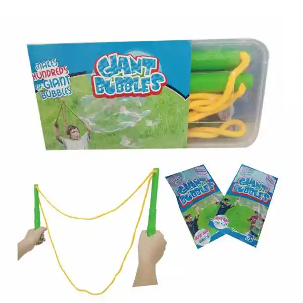 Los niños pueden crear burbujas gigantes con esta varita de burbujas de estilo cuerda. Solo tienes que añadir agua a los paquetes de solución. Hace cientos de burbujas gigantes.Incluye una varita de burbujas flexible (estilo cuerda) y dos paquetes de solución de burbujas. Medidas: 17x12cm caja