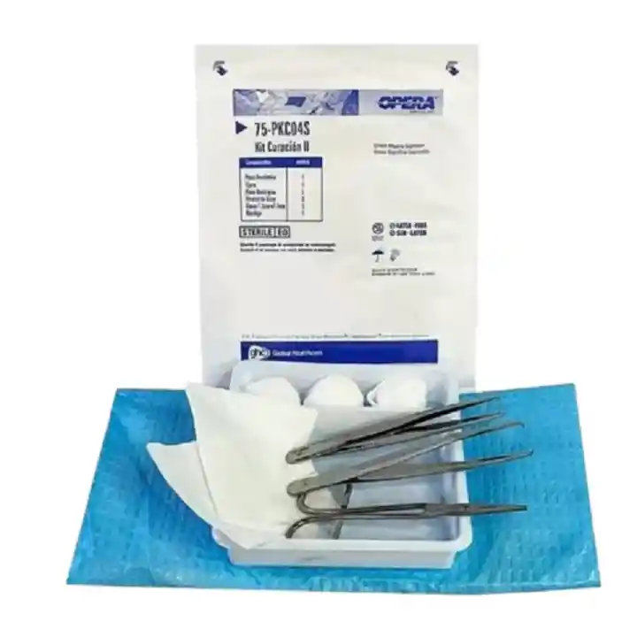 Kit de curación estéril y desechable con pinzas. Ideal para procedimientos médicos seguros y libres de riesgos. Contiene : 1 bandeja plástica 1 pinza anatómica 1 pinza quirúrgica 1 tijera 2 gasas de 7,5cm x 7,5cm 3 tórulas de gasas 1 campo estéril Esteril Libre de Latex